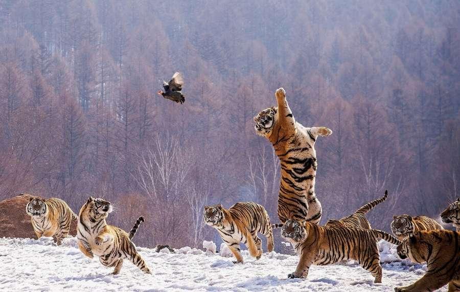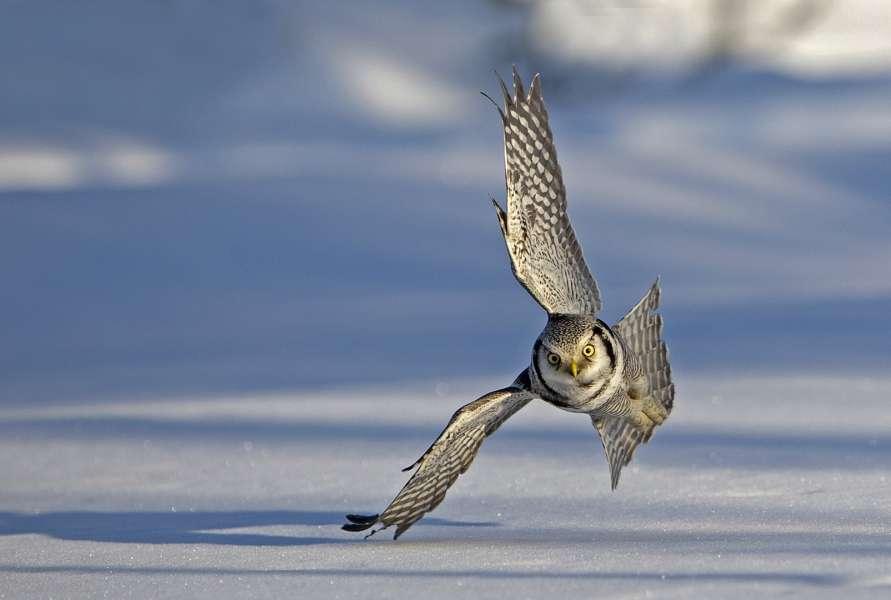 Hawk Owl hunting over snow