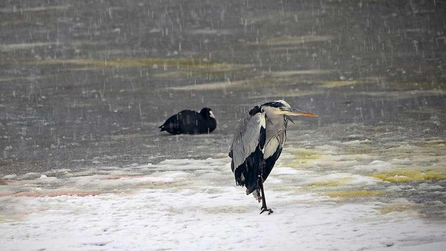 Grey Heron In Snowstorm