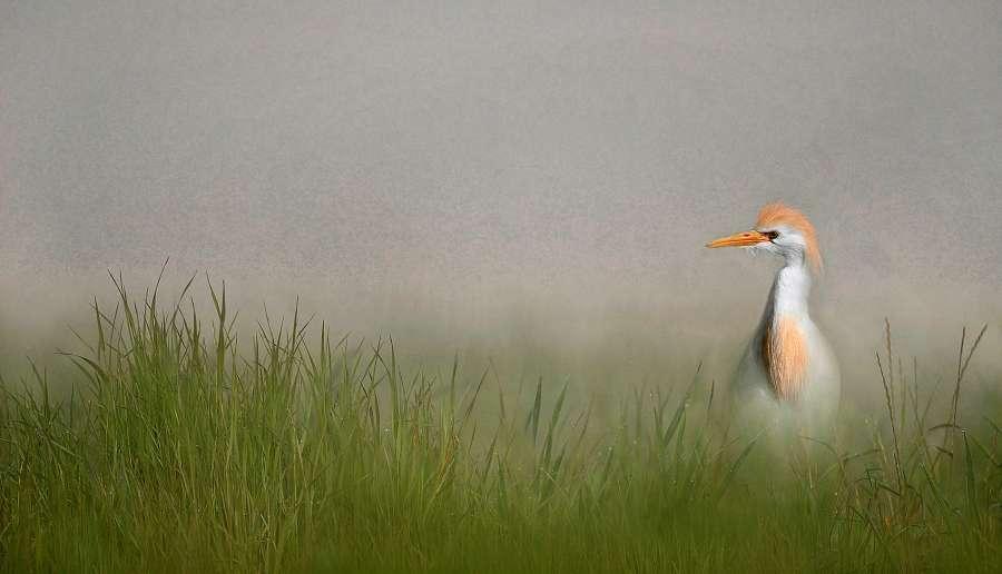 Koereiger in de mist