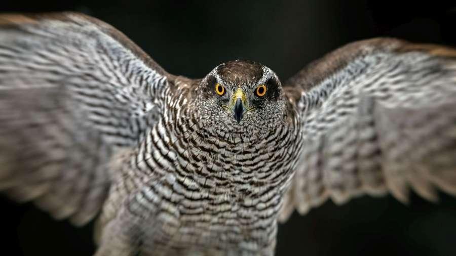 great grey owl lands at dusk